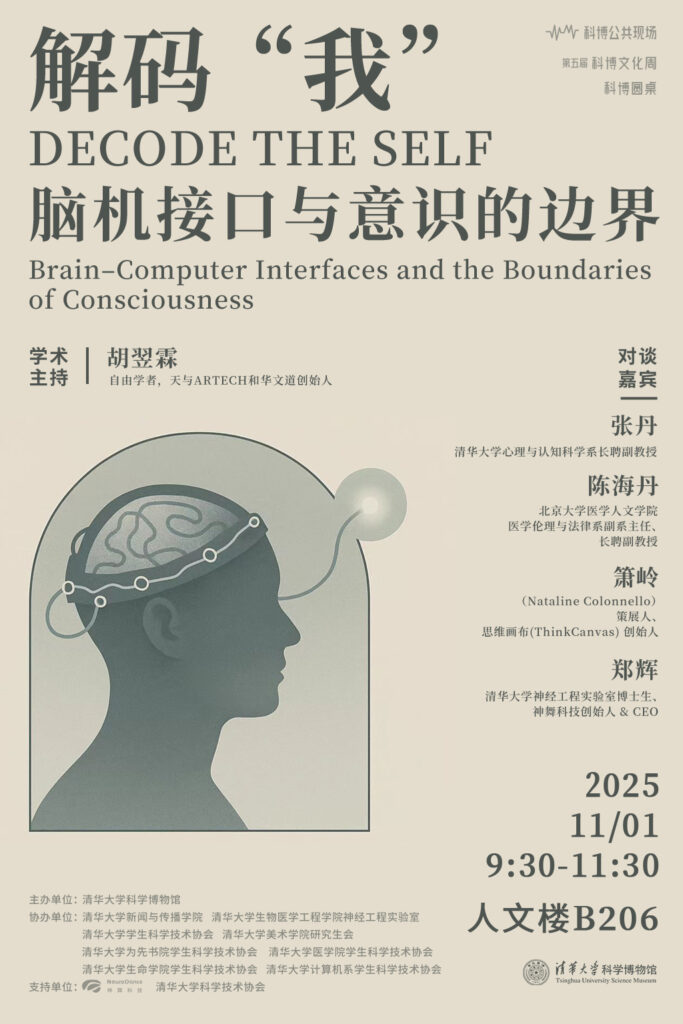 2025年11月1日,我受邀回清华,参加科博文化周《界面中的我:脑机接口与意识的未来》下的第三场活动《解码“我”:脑机接口与意识的边界》圆桌对谈活动,我担任学术主持,其实这大概是我第一次在比较正式的活动中担任主持人,不过我感觉我做得还不错,既夹带了自己的私货,又让几位嘉宾都充分发挥了。我这里贴出我事先准备的导引词,实际主持的时候我是临场发挥的,和备稿很不一样。每位嘉宾我都先后提了两个问题。
