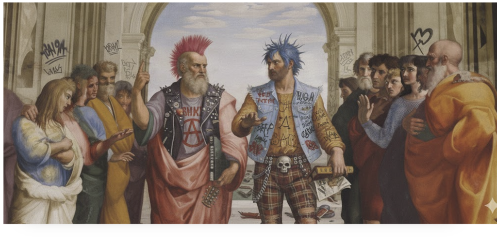 朋克主张每个人——不需要精英提携,不需要昂贵的设备,不需要特定的培训,不需要身份的门槛,都可以自己上手做音乐。苏格拉底也主张每个人都可以自己来思考和辩论。苏格拉底说:我就是助产士——不是我要说服你,而是我帮助你自己说服自己。“认识你自己”是哲学的永恒的主题,甚至在某种意义上是唯一的主题,每个人都可以随时——不需要预先学习各种精巧的概念——开始反思,认识自己和自己所处的环境。